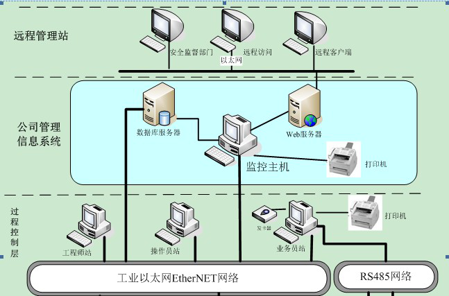 系统分为四层:远程管理站、监控中心、现场控制站以及现场各种仪表设备。