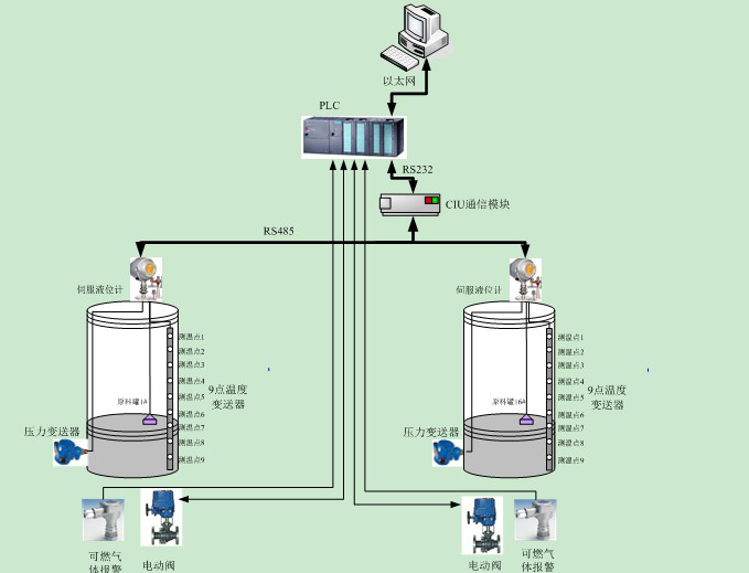 l 将压力变送器、9点温度变送器全部接入到伺服液位计,伺服液位计通过CIU通信模块接到PLC的通信模块,PLC通过BPM协议来解析出压力、温度、液位、密度、界面等数据,并通过以太网传送到上位机,上位机软件通过采集到的数据计算罐内油品的平均温度,采用综合密度法计算平均密度,根据体积数据计算出罐内油品质量。每个储罐配有罐容表,不同的高度,通过查罐容表可以查出不同的体积,并且可以通过压力修正法可以修正体积,通过温度修正法可以修正体积。